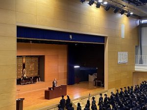 般若心経の読経後、植野学校長から「2学期は文化祭、修学旅行、文化体験教室と行事が盛り沢山でした。みなさんはこの2学期を振り返ってどのような印象を持ちましたか。上手くいったこと、失敗してしまったこと、色々あるかと思います。新年を迎えるにあたって今年のまとめをし、3学期に気持ちを新たに目標をもって投稿してください」とお話がありました。