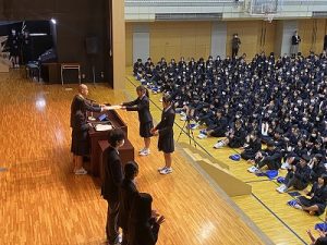 最後に校歌斉唱、活躍した部活動、英検取得者の表彰を行い終業式を終了しました。