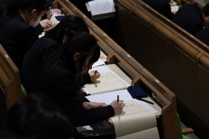 今回3年生が書いた写経は卒業式で本校アリーナの仏壇本尊に奉納後、高野山奥之院の学園供養塔に納められます。