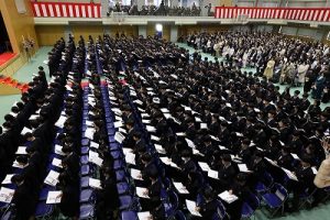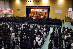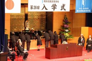 聖歌、献香献花、般若心経読経等の後、 植野学校長は「五百十名の新入生の皆さん、ご入学おめでとうございます。 教職員一同、皆さんの入学の日を楽しみに待っていました。