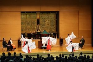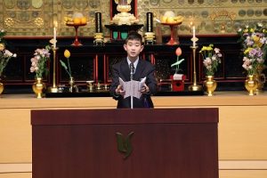 式典では、生徒有志による散華の舞、献香・献花、読経・回向、新任の先生の灌仏の後、高野山大学 学長の松長潤慶僧正より記念講話をしていただきました。